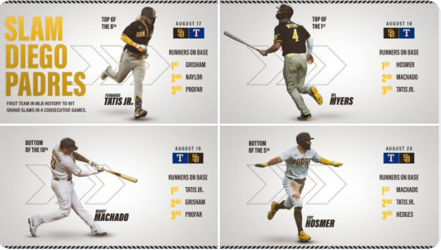 Saturn Brings Padres’ Four Grand Slams in Four Days Posted on August 21, 2020 By cesarlove (Aug 21, 2020) Between August 17 and August 20, the Padres hit an unprecedented four grand slams in four consecutive games under compound Saturn transits. The planet Saturn rules grand slams, and the stage was set for these slams by the Padres’ natal Saturn of 22 degrees Aries receiving square aspects from Jupiter at 18 degrees Capricorn and Pluto at 23 degrees Capricorn. Then between August 17, when Fernando Tatis Jr. hit the first of the four grand slams, and Aug 20 when Eric Hosmer hit the fourth slam, both the Sun and Mercury formed a quincunx aspect to transiting Saturn at 26 Capricorn. The Sun and Mercury were also conjunct the Padres natal Jupiter of 28 Leo. San Diego Padres May 27, 1968 1:01 pm PDT Wil Myers’ grand slam Aug 18, 2020 6:30 pm PDT aproximate time Blogs